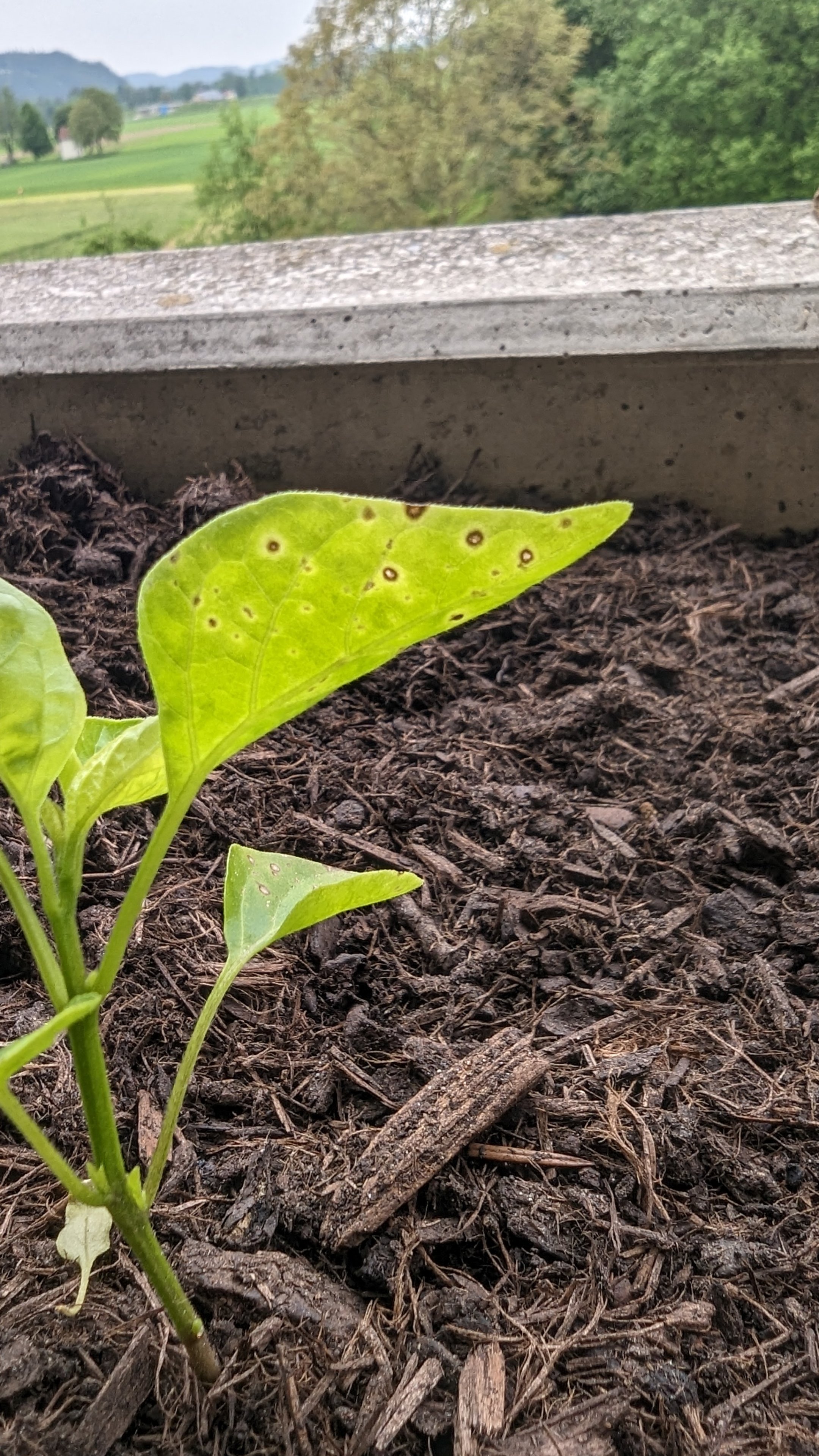 Ich hab mehrere Chilipflanzen auf dem Balkon stehen, seit Anfang/Mitte Mai und eine der Pflanzen bekommt braune Stellen auf den Blätter. Es tritt an den älteren Blättern auf, die jüngeren sind noch schön grün. Es ist komischerweise auch die Pflanze, die am stärksten wächst?!