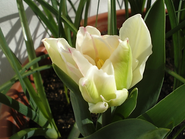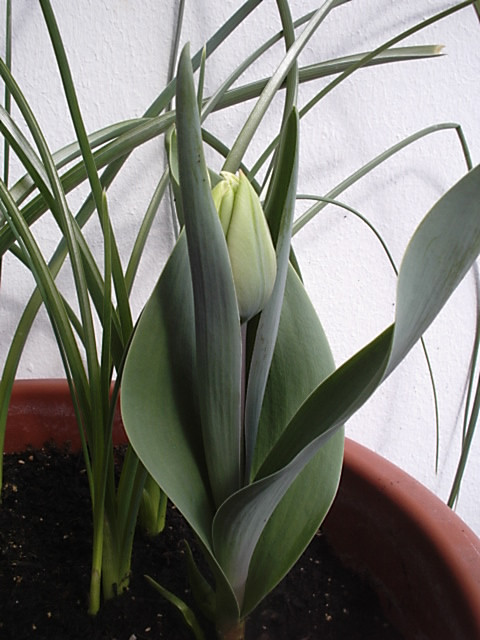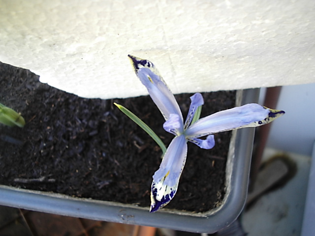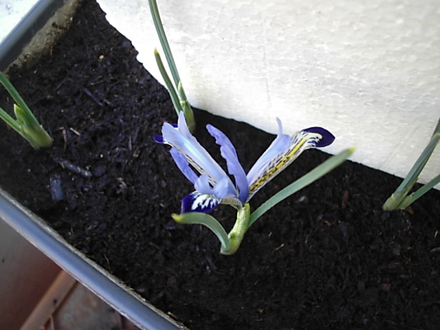 Die im November gesteckten Zwergiris-Zwiebeln, spitzen schon vorsichtig, aus der Erde raus.