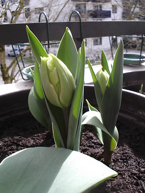 Die draußen überwinterten Hollandiris, die im Sommer sooo schön geblüht hatten, treiben schon