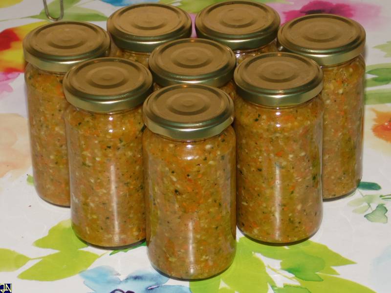 Dann kommen pro 1kg Gemüse 200-250g Salz hinzu und alles wird sehr gut vermischt. Dann fülle ich alles in Twist-Off-Gläser. Beim Abfüllen muß man immer wieder durchrühren, um es gleichmäßig abfüllen zu können, weil das Salz schnell beginnt Flüssigkeit aus dem Gemüse zu ziehen.