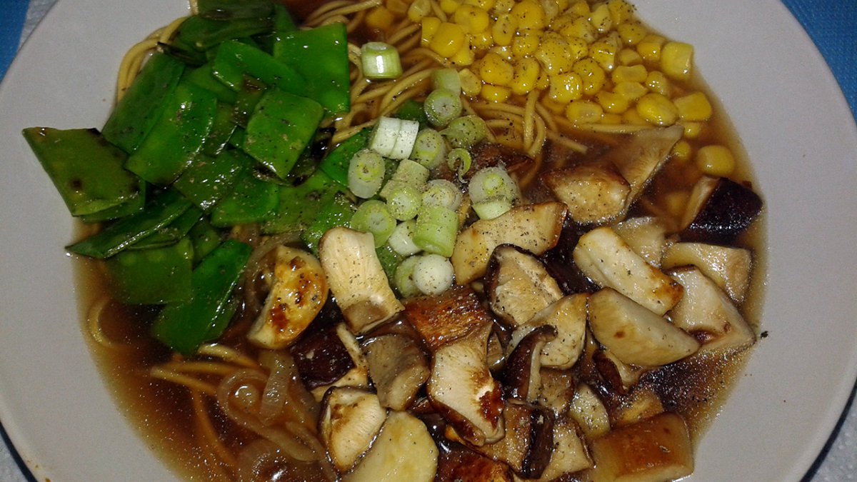 Und am Wochenende gab es noch was richtig gutes: Vegetarische Miso-Ramen - mit einer tollen Gemüse-Pilzbrühe, Shiitake, Kräuterseitlingen, Zuckerschoten, Zwiebeln und gebratenem Mais. Dazu etwas Sesampaste und Sesamöl.