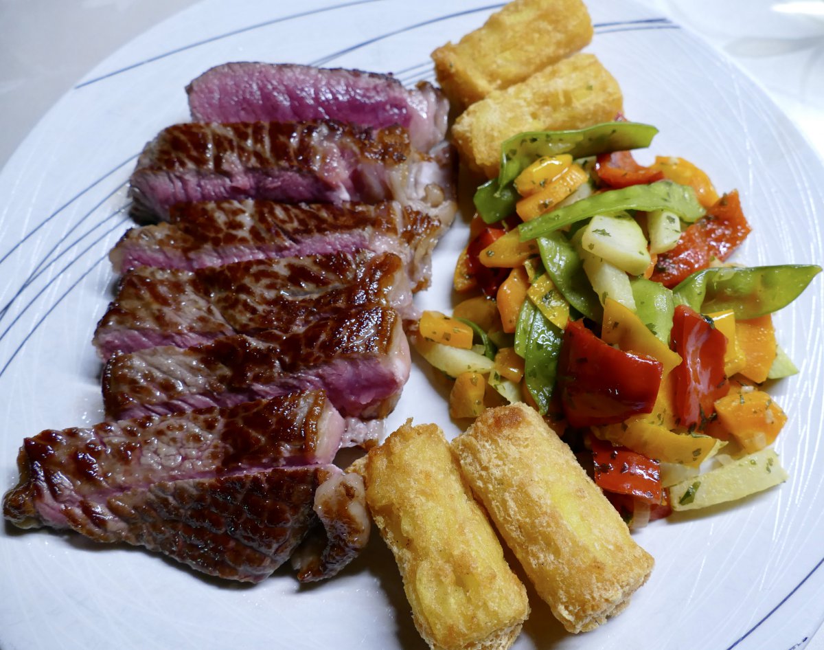 Mein Geburtstags-Essen: Steak vom Wagyu Rind, Kroketten und Butter-Gemüse vom Garten (Chilis und Paprika, Kohlraben, Karotten und Kefen. Dazu ein Glas Wein.