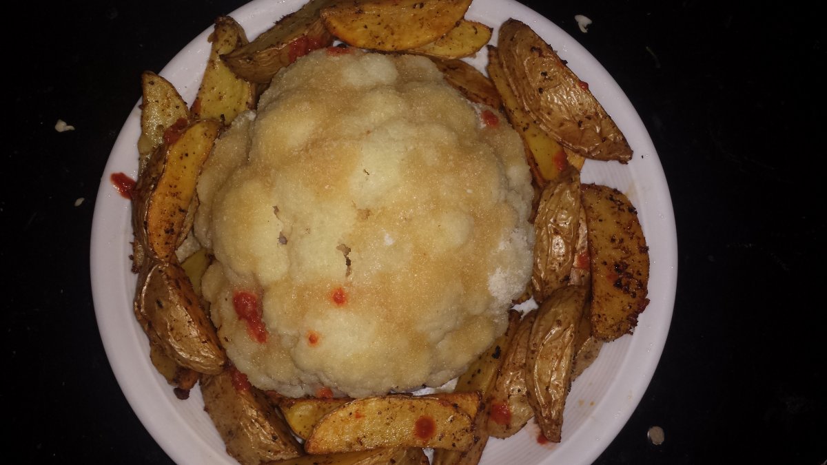 Nachtmahl: Gedämpfter, panierter, gebutterter Blumenkohl mit Ofenkartoffeln und Puckerbutt/Ed Currys Carolina Reaper Sauce.