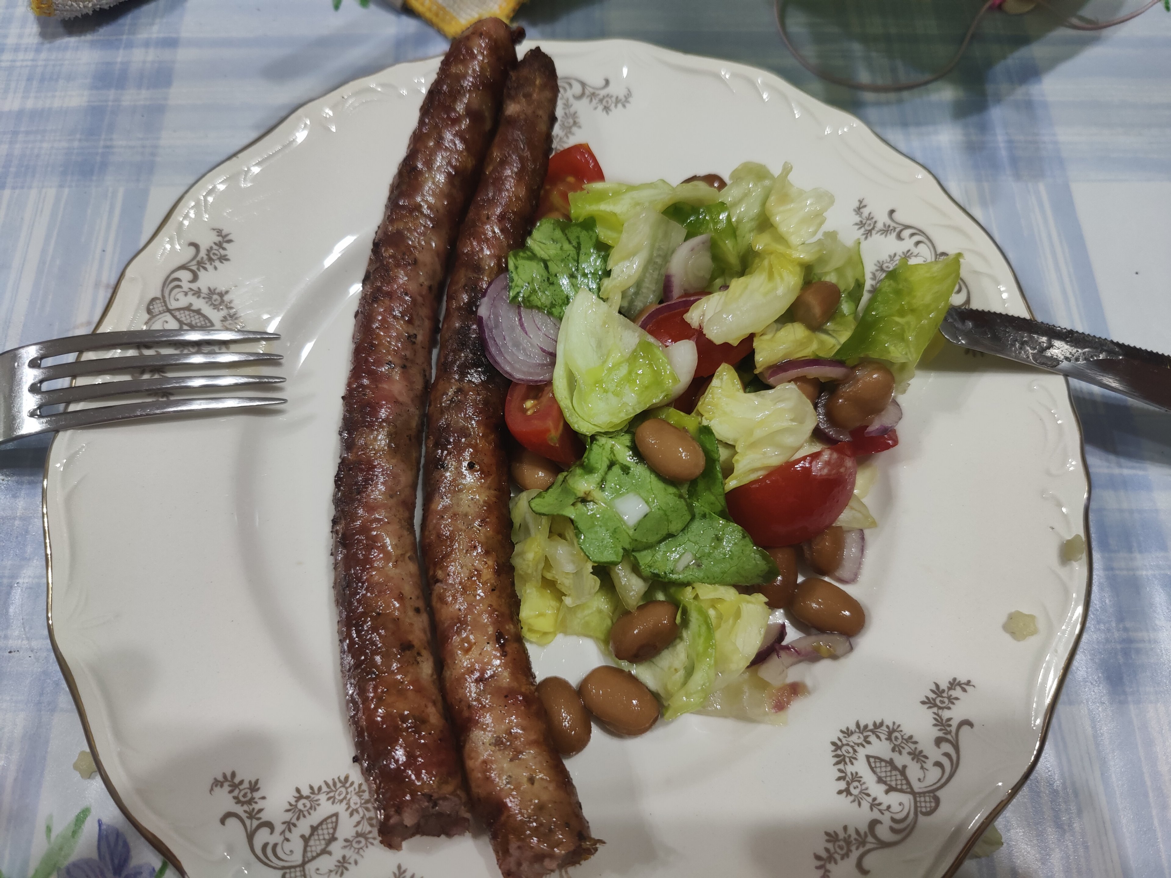 Die Kaktusfeige mittig links guckt mich an! :OSalsiccia (bzw ein Drittel der gesamt Wurst) mit Salat und als Nachtisch frische Kaktusfeigen.