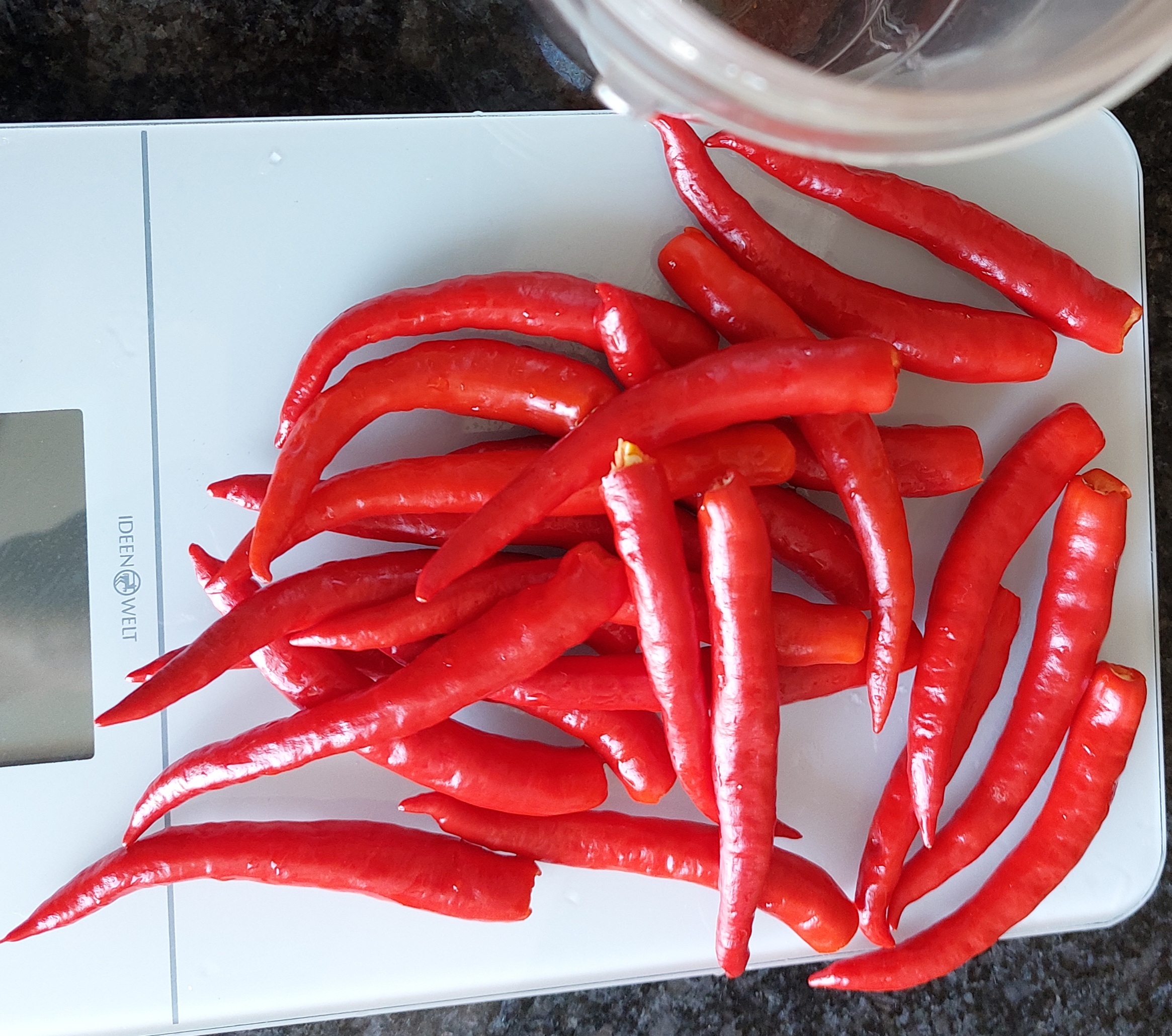 Einfach 200g gemischte Chilis mit nem Schluck Wasser püriert und über 300g grobes Steinsalz gegeben. Zieht jetzt seit einer Woche darf noch eine weitere Woche ziehen und wird dann geteocknet.