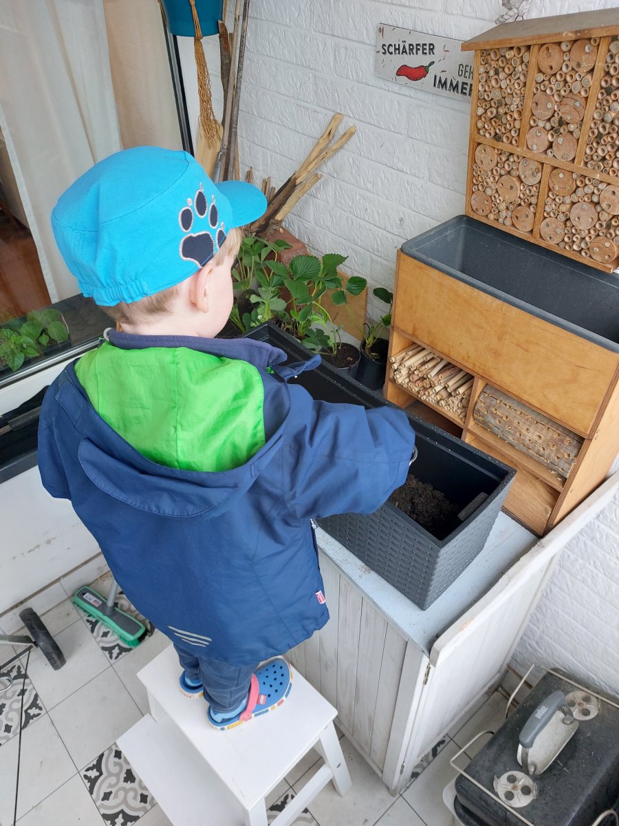 Ein Hoch auf den HelferHeute mal was anderes: es ging an den Naschbalkon. Mein Nachwuchsgärtner hat schon mal die Balkonkästen für die Erdbeeren vorbereitet: