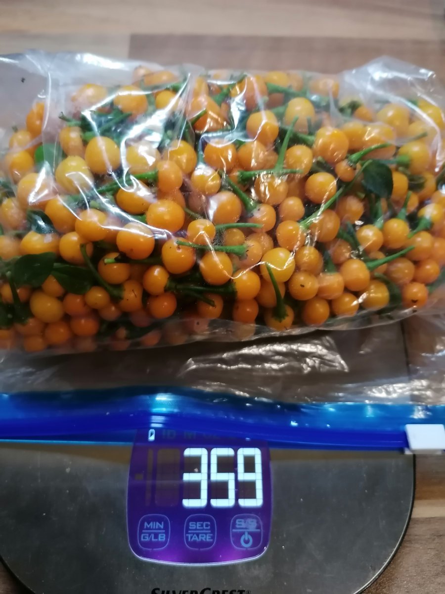 das ist die Ausbeute von 3 Pflanzen und einer Stunde ArbeitGanz schönes Paket, da warst du mit der Ernte bestimmt ein bisschen beschäftigt. Meine Chupetinhaernte ha deutlich länger als bei den anderen Sorten gedauert.