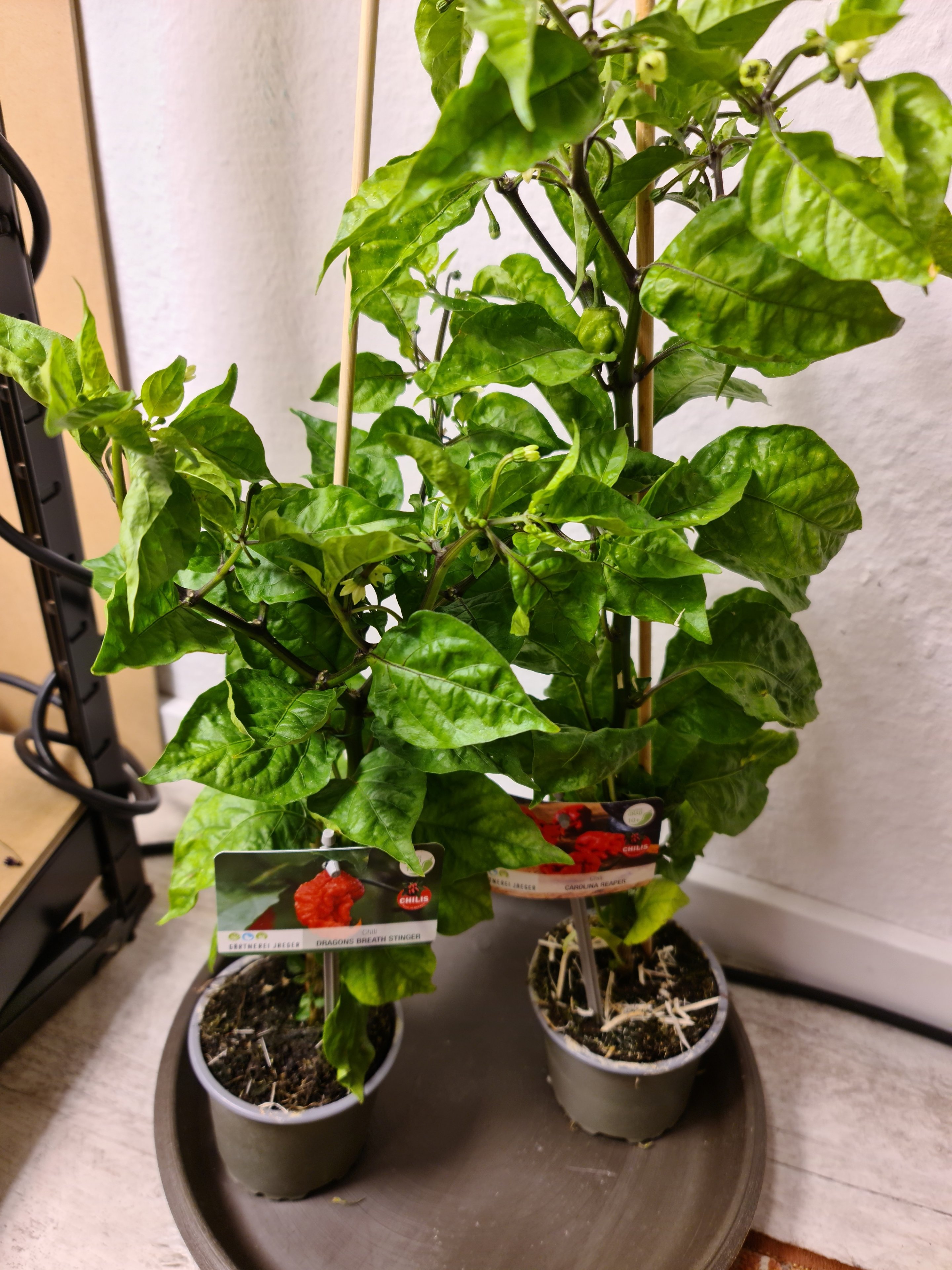 Nach meiner spontanen Aktion "Ich bin gerade so geil auf Superhots und kaufe mir noch Pflanzen" ist ein halbes Chaos geworden. Sie stehen jetzt auf dem Balkon im Exil und wurden mit Schmierseife und Spiritus eingenebelt. Sie werden definitiv draussen bleiben, egal ob sie sich erholen oder nicht. Das schlimmste ist aber, die Viecher sind mindestens auf zwei Cayenne Orange ĂŒbergesprungen. Diese wurden heute auch eingenebelt und wieder reingeholt... Fingers Crossed.