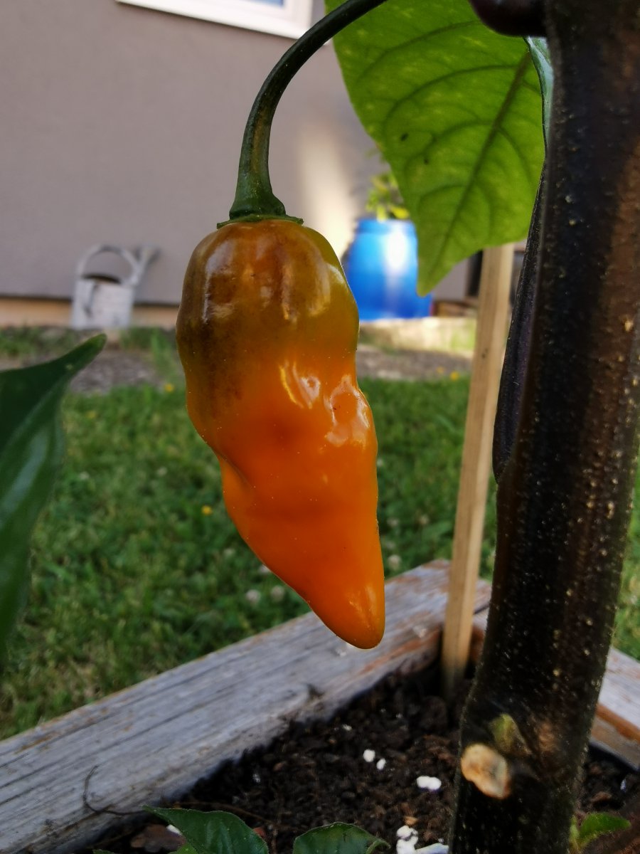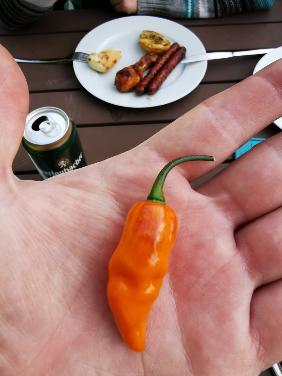 Gestern gab es beim Grillen die erste reife Limon x PdN, schmeckt mir sehr gut, chinensig. Schon sehr scharf, aber fruchtig, wenn man hinterher gleich etwas anderes isst wird man die Schärfe auch schnell wieder los :thumbsup:. Die beiden Kumpels, die auch jeweils eine Limon x PdN Pflanzen bekommen haben waren auch dabei und fanden die Beere lecker, wir haben sie brüderlich geteilt.