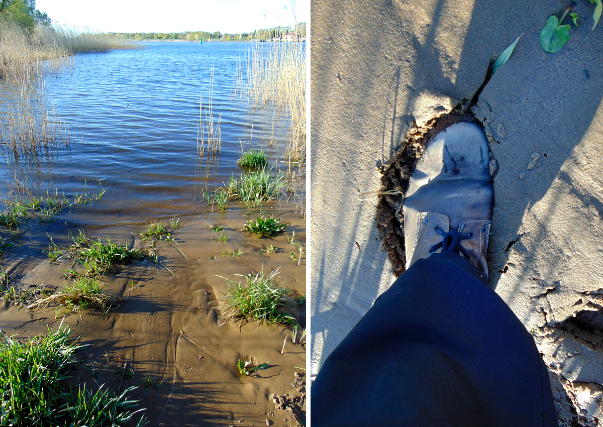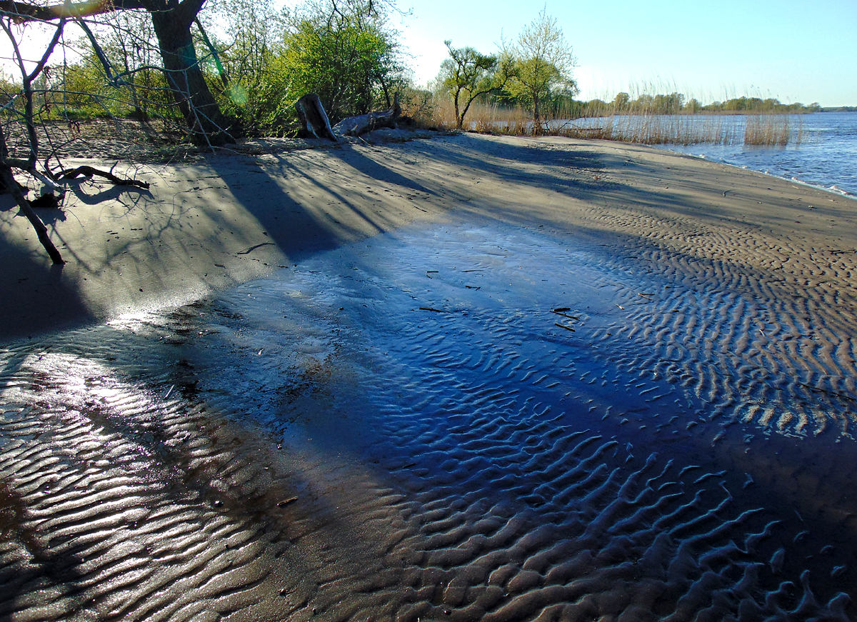 Anhang anzeigen 282384Bei Hochwasser ist fast der gesamte Strand überspült, wie man hier an den Spuren des abfließenden Wassers erkennen kann. Hier sind wir schon am Ende des Strandes vor der kleinen Bucht der Weser angekommen. Es gibt vorher wirklich nichts, das interessant zu fotografieren wäre.
