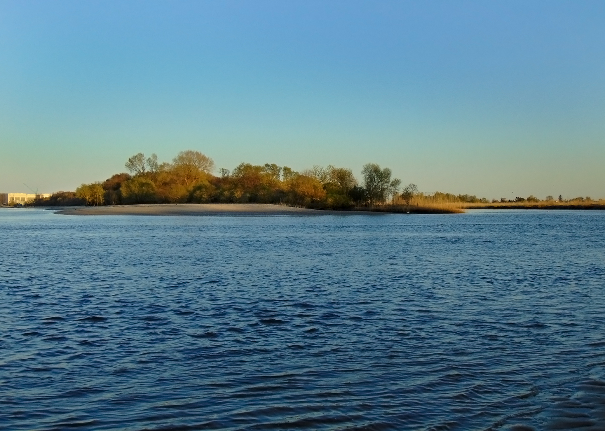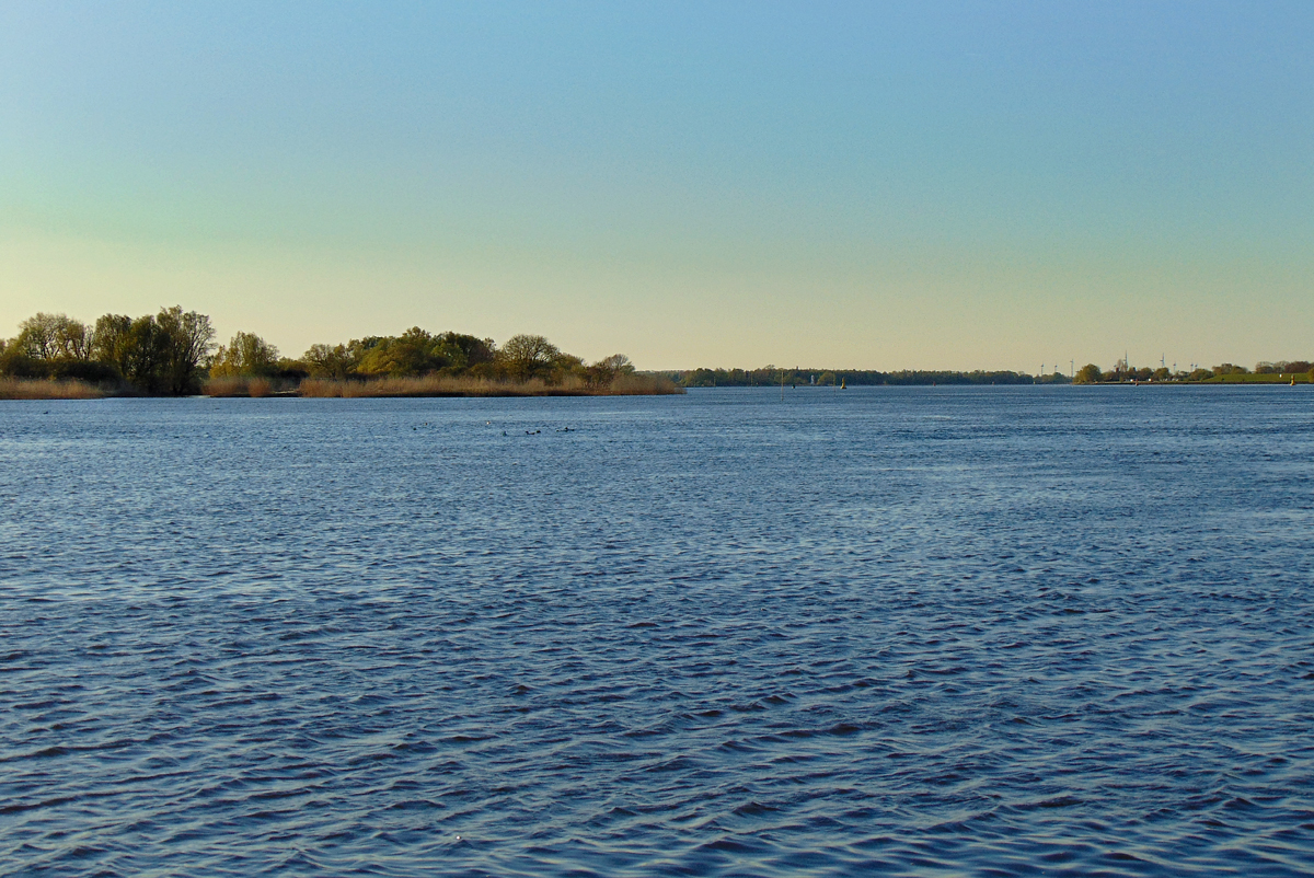 Lassen wir den Blick noch einmal in die Ferne schweifen. Am Horizont die Weserhalbinsel "Elsflether Sand" -