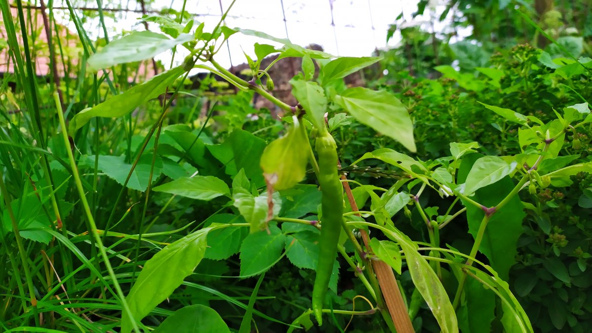 So, die Schote ist nun reif, hab ich angenommen. Von Orange zu rot. Die Überraschung habe ich erlebt, als ich reingebissen habe: Null Schärfe! Dafür sehr süß, leicht sauer. Sehr lecker.