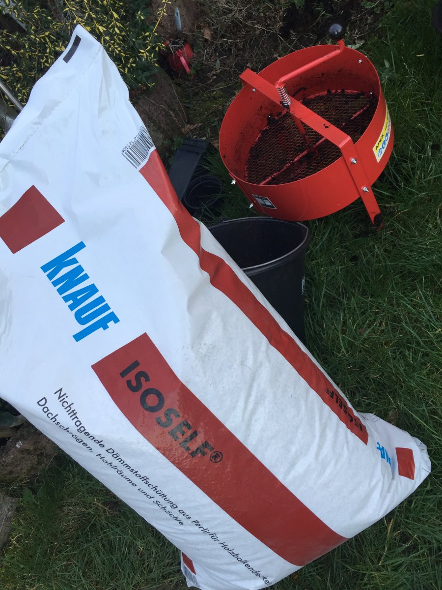 Perlite und das Handkurbelsieb für die Saison gesichert. Erste Erde aus dem Pflanzeimer wurde gesiebt.