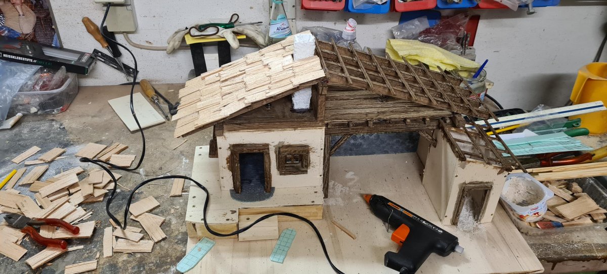 Richtige Krippenbauer nehmen da Kreidepulver und mischen das mit verschiedenen Komponenten. Mir ist das aber zu umständlich, ich hab einfach Uniflott Fugenspachtel genommen. Dieses mit feinen Räucherspänen gemischt und zu einer festen streichfähigen Masse verrührt. Dann aufgetragen. Hat dann ganz gut gehalten. Die Krippe halt immer auf die entgegengesetzte Richtung gekippt. So das nichts "runterrutschen" konnte. Nach paar Minuten war es angezogen und man konnte weiter auf andere Seite kippen.