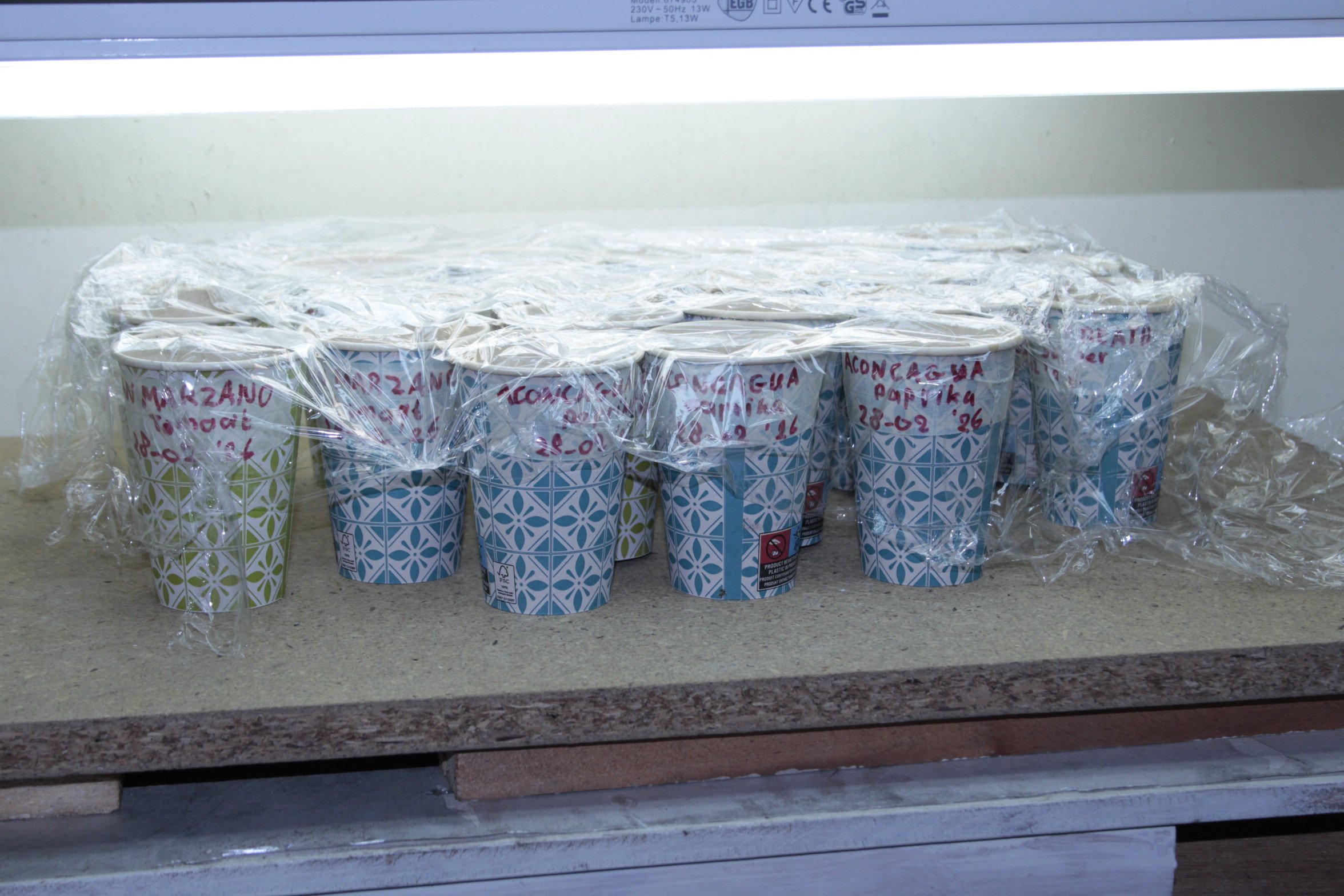 Trinkbecher aus Bambu pappe Material benutzt. Abgedeckt mit Folie, sodas es nicht schnell verdunstet und schön brühen kann.
