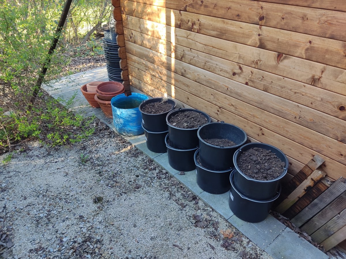 Hier auch noch ein weiterer Lagerort der Töpfe. Ganz links habe ich bei unserem lokalen Metzger ca. 25 10l Eimer abstauben können. Sind zwar nicht riesig, aber umsonst. Da der Metzger auch Catering anbietet, kann ich mir da theoretisch so viel solcher Eimer holen wie ich brauche. Da war hauptsächlich mal Fritierfett drin. Wem die Eimergröße ausreicht kann es also vllt. mal beim Metzer probieren ;)